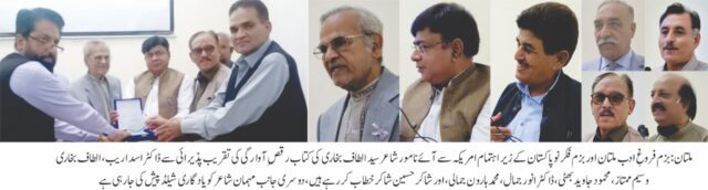 بزم فروغ ادب ملتان اور بزم فکرنوء کے اشتراک سے امریکہ سے آئے شاعر سید الطاف بخاری کے اولین شعری مجموعہ رقص آوارگی کی تقریب پذیرائی منعقد ہوئی جس کی صدارت پروفیسر ڈاکٹر اسد اریب نے کی ، جبکہ تقریب میں پروفیسر انور جمال ، وسیم ممتاز، محمود جاوید بھٹی، چودھری عطاالرحمان، محمد ہارون جمالی نےخصوصی شرکت کی۔