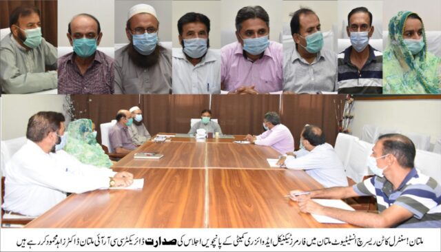 سنٹرل کاٹن ریسرچ انسٹیٹیوٹ ملتان میں فارمرز ایڈوائزری کمیٹی کا پانچواں اجلاس ڈائریکٹر سی سی آر آئی ڈاکٹر زاہد محمود کی صدارت میں ہوا،اس اجلاس میں چاروں صوبوں کے کپاس کے کاشتکاروں کی رہنمائی وتربیت کے لئے پندرہ روزہ کپاس کی نگہداشت سے متعلق یکم اگست تا 15اگست تک کی سفارشات پیش کی گئیں۔