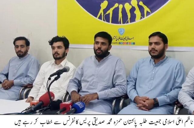ناظم اعلیٰ اسلامی جمعیت طلبہ پاکستان کے حمزہ محمد صدیقی ،حسن بلال ہاشمی ، دانیال عبداللہ نے پریس کانفرنس سے خطاب کرتے ہوئے کہا کہ پاکستان میں تعلیم حکمرانوں کی ترجیح میں شامل نہیں ہے۔