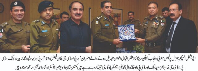 ایڈیشنل انسپکٹر جنرل پولیس جنوبی پنجاب کیپٹن ریٹائرڈ ظفر اقبال اعوان نے کہا ہے کہ جنوبی پنجاب سے تبدیل ہونے والے پولیس افسران محکمانہ امور پر پیشہ ورانہ دسترس رکھتے ہیں اپنی تعیناتی کے دوران ان افسران نے لوگوں کے جان و مال کے تحفظ کو یقینی بنانے کی ہر ممکن کوشش کی اور جرائم پیشہ عناصر کی سرکوبی کے لیے کوشاں رہے ۔