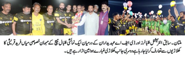 سابق انٹر نیشنل فٹبالرز اور ڈی ایف اے ملتان کے عہدیداران کے درمیان ایک نمائشی فٹبال میچ گذشتہ شب قلعہ کہنہ قاسم باغ اسٹیدیم کی جگمگاتی روشنیوں میں کھیلا گیا ۔