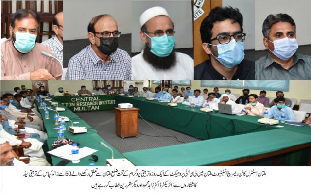 تربیتی پروگرام کے شرکاء سے خطاب کرتے ہوئے ڈائریکٹر سی سی آر آئی ملتان نے ادارہ ہذا کے اغراض و مقاصد اور کپاس کے میدان میں مستقبل کے چیلنجز سے نپٹنے کے لئے ادارہ کی کاوشوں کا تفصیل سے ذکر کیا انہوں نے کہا کہ کپاس کی اچھی پیداور کے حصول کے لئے جدید ٹیکنالوجی کا استعمال اور اس کی منتقلی ناگزیر ہے۔