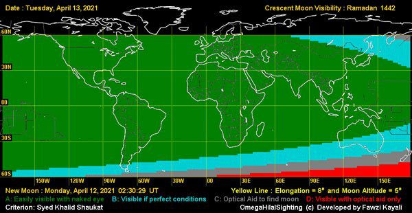 اس ویب سائٹ پر ایک تفصیلی نقشے کے ذریعے رمضان المبارک 1442 ہجری کے چاند سے متعلق پیش گوئی کی گئی ہے: