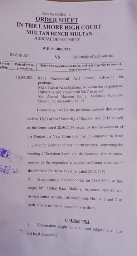 عدالت عالیہ ملتان بنچ نے یونیورسٹی آف ساہیوال کے وائس چانسلر کے احکامات کو معطل کرتے ہوئے 21اپریل کو جواب طلب کرلیابتایا گیا ہے کہ بخش علی نامی شخص نے عدالت عالیہ لاہور ملتان بینچ میں رٹ دائر کی کہ یونیورسٹی آف ساہیوال میں مستقل وی سی کے نہ ہونے سے قائم مقام وائس چانسلر نے خلاف میرٹ تعیناتیاں کرنے کی کوشش کررہے ہیں .جبکہ متعدد ٹھیکے بھی من پسند افراد کو دئے ہیں انہوں دسمبر2018 میں فیکلٹی کی بھرتی کے لیے اخبارات میں اشتہارات دیے اس اشتہار پر بھرتیوں کا سلسلہ تاحال 2021 نا مکمل ہے۔2018 میں مشتہر آسامیوں کی بجائےمن پسند افراد کو نوازنے کےلئے نیا اشتہار جاری کردیاگیاجس کی اسامیاں یونیورسٹی کے بجٹ میں منظور شدہ ہی نہ ہیں نئی پیدا شدہ آسامیوں کی تختیاں ذاتی تعلقات کی بنا پر پہلے ہی وی سی کے دفتر کے باہر نصب کر دی گئیں ہیں۔