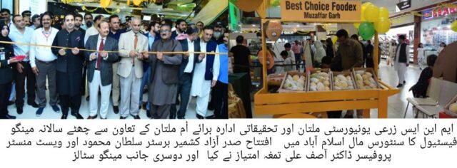 مینگو فیسٹیول کا افتتاح صدر آزاد کشمیر برسٹر سلطان محمود چودھری نے ہمراہ وائس چانسلر پروفیسر ڈاکٹر آصف علی (تمغہ امتیاز) مرزا محمد آفریدی ڈپٹی چیئرمین سینیٹ، ڈاکٹر عابد قیوم سلہری، ڈاکٹر محمد نواز خان نے کیا۔
