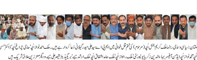 زکریایونیورسٹی کے ایڈمن آفیسر نواز بچہ کے والد، انسٹی ٹیوٹ آف مینجمنٹ سائنسز کے پروفیسر ڈاکٹر حسن بچہ کے چچا معروف سماجی کارکن ملک کریم بخش بچہ مرحوم کی روح کے ایثال ثواب کےلئے رسم قل خوانی ادا کی گئی جس میں سید علی حید ر گیلانی نے دعا کرائی، شرکا میں حاجی چراغ بچہ، ملک حامد اشفاق ، ملک ارشد مہے، بریگیڈیر قیصر علی مہے ، ملک ربنواز بچہ، سمیت عمائد ین شہر کی بڑی تعداد شامل تھی ، تقریب میں مرحوم کے درجات کی بلندی کےلئے قران خوانی بھی کی گئی ۔