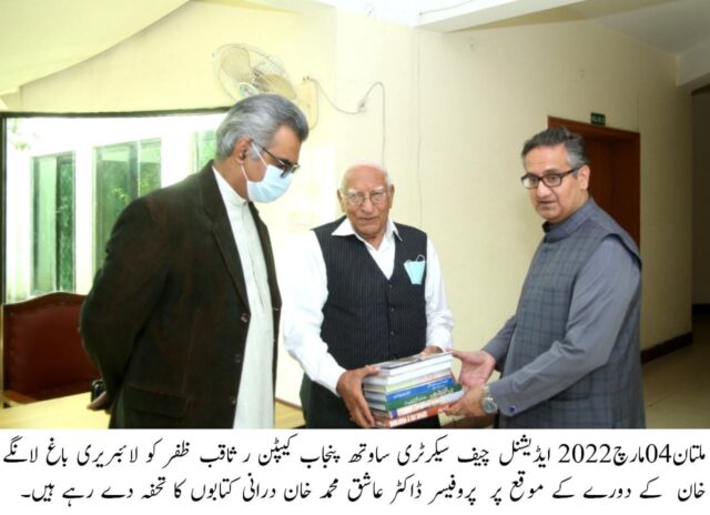 ڈاکٹر عاشق درانی نے ایڈیشنل چیف سیکرٹری ساوتھ پنجاب اور سیکرٹری آثار قدیمہ کو مختلف کتابیں پر مشتمل تحفہ پیش کیا۔