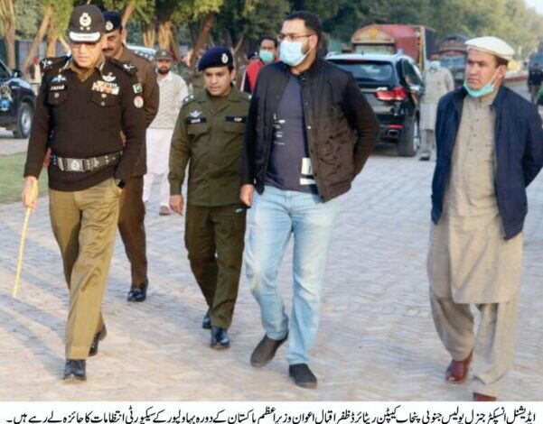 ایڈیشنل انسپکٹر جنرل پولیس جنوبی پنجاب کیپٹن ریٹائرڈ ظفر اقبال اعوان نے وزیر اعظم پاکستان کے دورہ بہاولپور کے حوالہ سے حفاظتی انتظامات کا جائزہ لیا، انہوں نے ہدایت کی کہ حفاظتی اقدامات میں کسی قسم کی غفلت یا کوتاہی کا مظاہرہ نہ کیا جائے اور وزیراعظم کے دورہ کے دوران ٹریفک پلان اس طرح ترتیب دیا جائے کہ ٹریفک کی روانی میں کوئی خلل نہ آئے۔