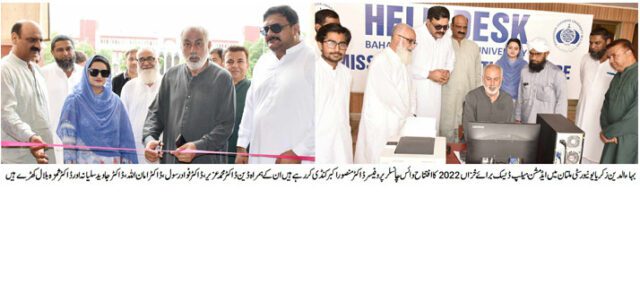 بہاء الدین زکریایونیورسٹی ملتان کے وائس چانسلر پروفیسر ڈاکٹر منصور اکبر کنڈی نے یونیورسٹی میں ایڈمشن ہیلپ ڈیسک برائے خزاں 2022 کا افتتاح کیا۔