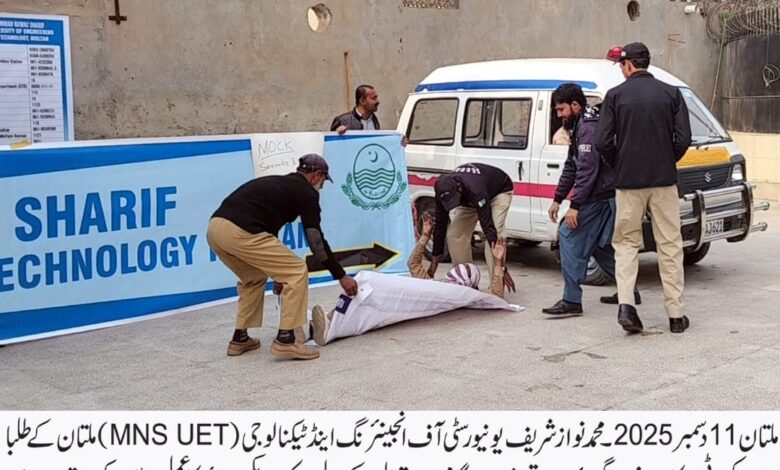 محمد نواز شریف یونیورسٹی آف انجینئرنگ اینڈ ٹیکنالوجی ملتان میں دہشت گردی سے حفاظت کے لیے موک ایکسرسائز کا انعقادکیا گیا جس میں ایم این ایس یو ای ٹی میں دہشت گردی سے تحفظ اور ہنگامی صورتحال سے نمٹنے کی تیاری کروائی گئی۔
