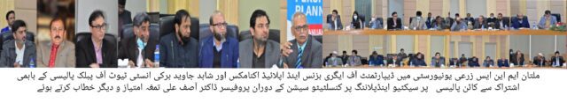 ایم این ایس زرعی یونیورسٹی میں ڈیپارٹمنٹ آف ایگری بزنس اینڈ اپلائیڈ اکنامکس اور شاہد جاوید برکی انسٹی ٹیوٹ آف پبلک پالیسی کے باہمی اشتراک سے کاٹن پالیسی پر سیکٹیو اینڈپلاننگ پر کنسلٹیٹو سیشن کا انعقاد کیا گیا۔