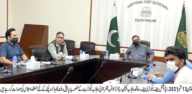 ایڈیشنل چیف سیکرٹری ساوتھ پنجاب کیپٹن ر ثاقب ظفر کی زیر صدارت منصوبے پر پیش رفت کا جائزہ لینے کے لئے اجلاس منعقد ہوا ، جس میں ایڈیشنل سیکرٹری رضوان قدیر اور آئی ڈیپ کے انجنئیرز نے شرکت کی۔