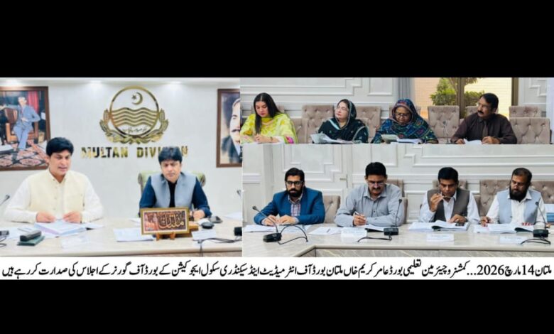 تفصیل کے مطابق کمشنر ملتان ڈویژن و چیئرمین تعلیمی بورڈ عامر کریم خاں کی زیر صدارت ملتان بورڈ آف انٹرمیڈیٹ اینڈ سیکنڈری ایجوکیشن کے بورڈ آف گورنرز کا اجلاس منعقد ہوا، جس میں مختلف انتظامی و امتحانی امور سے متعلق ایجنڈا زیر غور لائے گئے۔