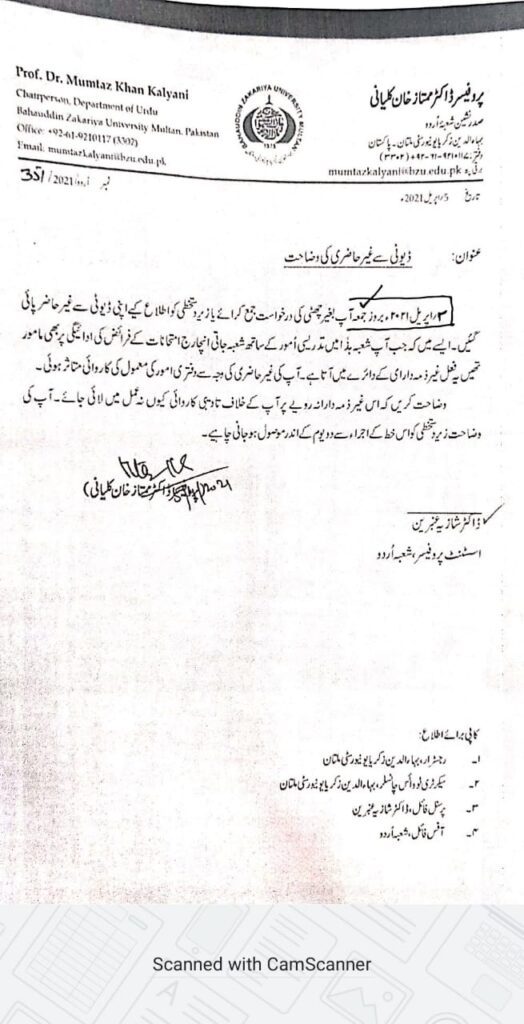 زکریا یونیورسٹی میں ایک اور ہراسمنٹ کیس کی بازگشت،اسسٹنٹ پروفیسر کا لیٹر سامنے آگیا۔