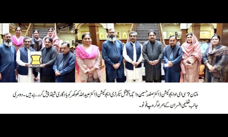 سی ای او ایجوکیشن ملتان ڈاکٹر صفدر حسین واہگہ نے کہا ہے کہ سپیشل سیکرٹری ایجوکیشن ساؤتھ پنجاب ملتان ڈاکٹر عبیداللہ کھوکھر کی گراں قدر تعلیمی خدمات لائق تحسین ہیں، ان کی علمی، ادبی، انتظامی اور تعلیمی خدمات کو ہمیشہ یاد رکھا جائے گا۔