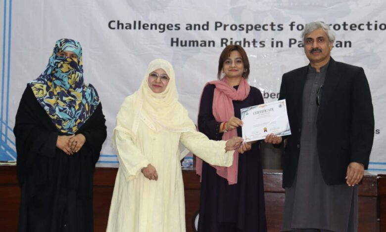 وائس چانسلر ڈاکٹر کلثوم پراچہ نے انسانی حقوق کی عالمی اہمیت، پاکستان میں انسانی حقوق کی موجودہ صورتحال اور اس ضمن میں درپیش قانونی، سماجی اور معاشی چیلنجز پربات کرتے ہوئے کہا کہ انسانی حقوق کا تحفظ کسی ایک ادارے یا طبقے کی ذمہ داری نہیں بلکہ ایک اجتماعی قومی فریضہ ہے خواتین، بچوں، اقلیتوں، معذور افراد اور دیگر کمزور طبقات کے حقوق کے تحفظ کے لیے قانون سازی کے ساتھ ساتھ اس پر مؤثر عملدرآمد ناگزیر ہے۔