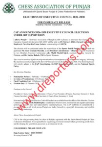 چیس ایسوسی ایشن آف پنجاب (CAP) نے ایگزیکٹو کونسل 2026 تا 2030 کے انتخابات کے شیڈول کا باضابطہ اعلان کر دیا ہے۔