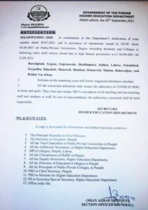 نوٹیفیکیشن کے مطابق پندرہ اضلاع میں قائم تمام پبلک اور پرائیویٹ سیکٹر کالجز اور یونیورسٹیز 12 ستمبر تک بند رہیں گی۔