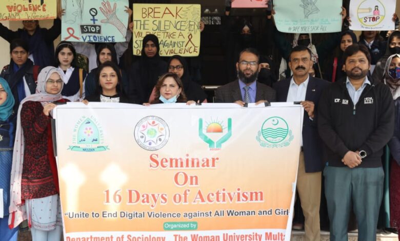 ویمن یونیورسٹی ملتان میں سوشیالوجی کے زیراہتمام ‘’خواتین و بچیوں کے خلاف ڈیجیٹل تشدد کے خاتمے‘‘ پر آگاہی سیمینار کا اہتمام کیاگیا ۔