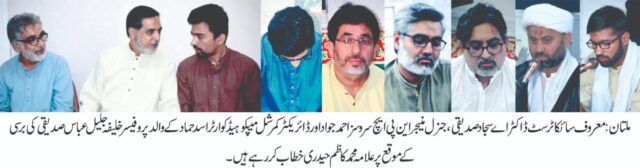 معروف سائکاٹرسٹ ڈاکٹر اے سجاد صدیقی، جنرل منیجر این پی ایچ سروسز احمد جواد ، ڈائریکٹرکمرشل میپکو ہیڈ کوارٹر اسد حماد کے والد بزرگوار اور سینئر میڈیکل سپیشلسٹ واپڈا ہسپتال ملتان ڈاکٹر علی عباس کے چچا پروفیسر خلیفہ جلیل عباس صدیقی کی برسی حیدریہ مسجد گلگشت ملتان میں ہوئی ۔