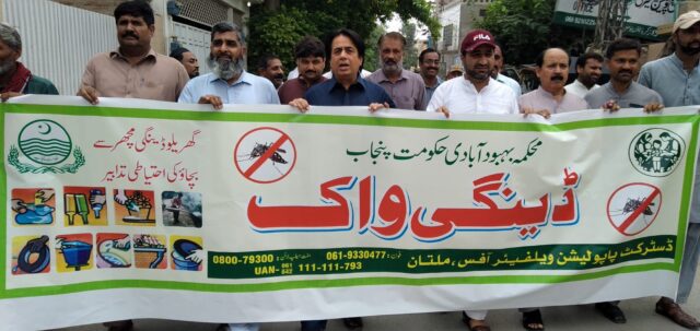 پنجاب حکومت کی ہدایت پر ڈسٹرکٹ پاپولیشن ویلفیئر آفس ملتان کے زیر اہتمام انسداد ڈینگی ڈے کے سلسلے میں ڈینگی مچھر سے پھیلنے والی بیماریوں سے بچاؤ کیلئے آگاہی واک کی گئی ۔