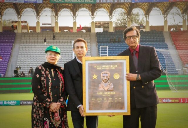 چیف ایگزیکٹو پی سی بی فیصل حسنین نے ہال آف فیم کی اعزازی ٹوپی فضل محمود مرحوم کی صاحبزادی شائشہ محمود اور اور اعزازی پلاک ان کے صاحبزادے شہزاد محمود کو دی۔
