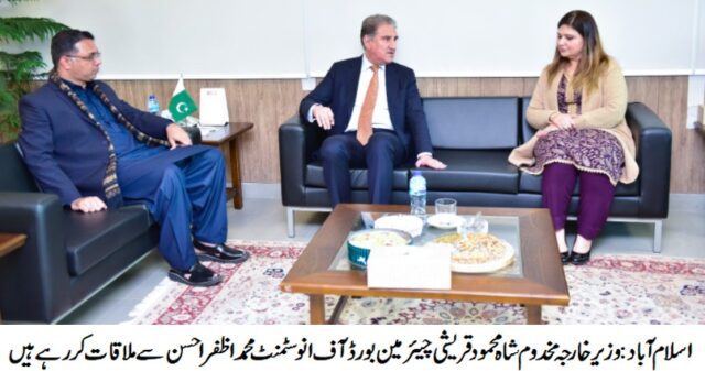 وزیر خارجہ مخدوم شاہ محمود قریشی نے پیر کو وفاقی سرمایہ کاری بورڈ کا دورہ کیا اور چیرمین بورڈ آف انوسٹمنٹ محمد اظفر احسن سے ملاقات کی۔