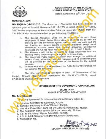 زکریا یونیورسٹی کے ملازمین کی سنی گئی ، مرادیں بر آئیں ، ایچ ای ڈی نے ڈسپیرٹی الاونس کا مراسلہ جاری کردیا۔