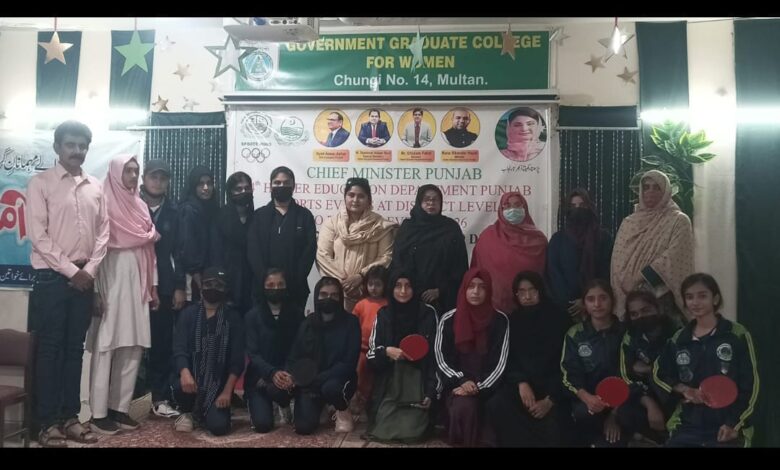 سی ایم پنجاب چوتھا ایچ ای ڈی ٹیبل ٹینس ایونٹ 26ـ2025ء گورنمنٹ گریجویٹ کالج برائے خواتین 14 نمبر چونگی ملتان میں اختتام پذیر ہو گیا٬ زینب اور فضہ ( ضلع خانیوال ) نے پہلی پوزیشن حاصل کی٬ تحریم اور فاطمہ (ضلع ملتان ) دوسرے نمبر پر رہا٬ وہاڑی کی ٹیم تھرڈ رہی۔