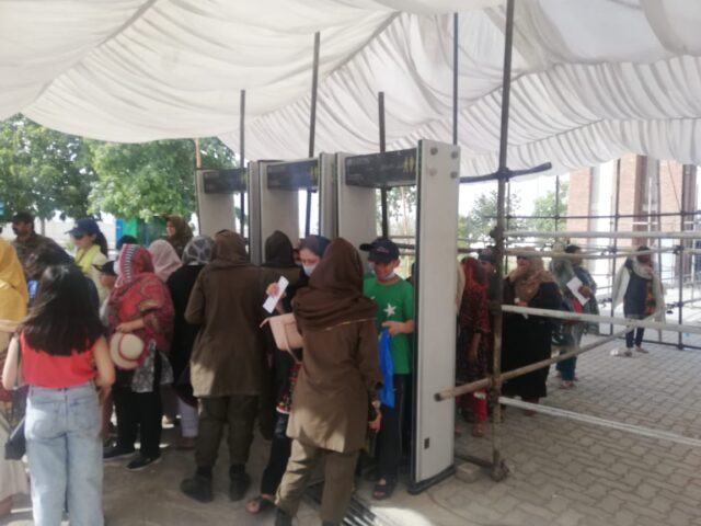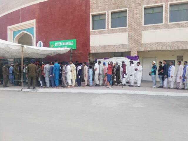 سٹیڈیم میں داخلے کے لئے شائقین کرکٹ کی لمبی قطاریں، اور سیکورٹی کے سخت انتظامات کئے گئے ہیں۔