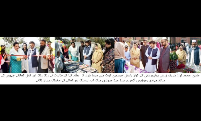 محمد نواز شریف زرعی یونیورسٹی کے گرلز ہاسٹل جیسمین کوٹ میں مینا بازار کا انعقاد کیا گیا، تقریب کا افتتاح رجسٹرار سمعیہ امرین ،پروفیسر ڈاکٹر عرفان احمد بیگ، پروفیسر ڈاکٹر عمر فاروق نے کیا۔