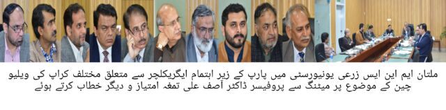 ملتان ایم این ایس زرعی یونیورسٹی میں پارب کے زیر اہتمام ایگریکلچر سے متعلق مختلف کراپ کی ویلیو چین کے موضوع پر میٹنگ کا انعقاد کیا گیا،جس کی صدارت چیئرمین پارب ڈاکٹر عابد محمود نے کی۔