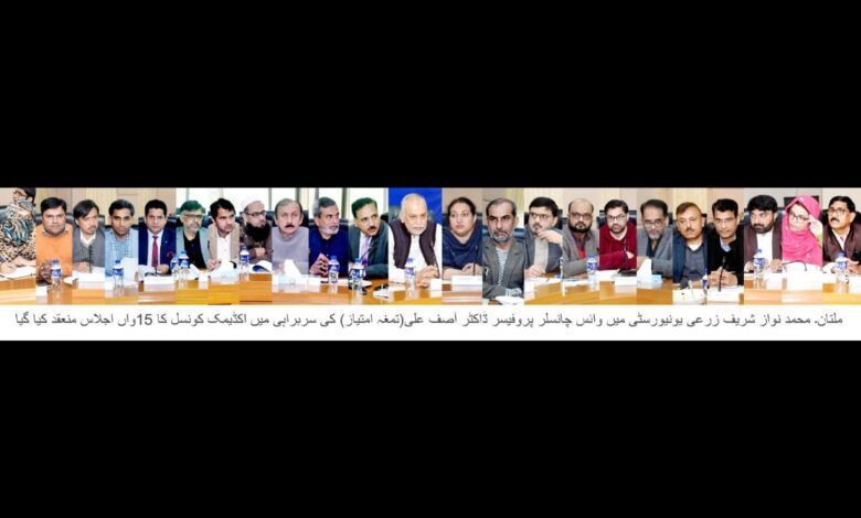 محمد نواز شریف زرعی یونیورسٹی میں اکیڈمک کونسل کا 15واں اجلاس وائس چانسلر پروفیسر ڈاکٹر آصف علی (تمغہ امتیاز)کی سربراہی میں منعقد ہوا۔