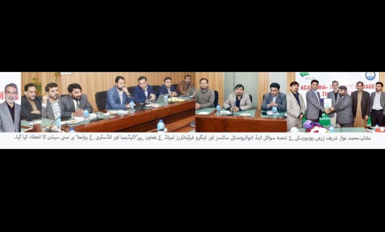محمد نواز شریف زرعی یونیورسٹی کے شعبہ سوائل اینڈ انوائرونمنٹل سائنسز اور اینگرو فرٹیلائزرز لمیٹڈ کے تعاون سے”اکیڈیمیا اور انڈسٹری کے روابط” پر مبنی ایک اہم سیشن کا انعقاد کیا گیا۔