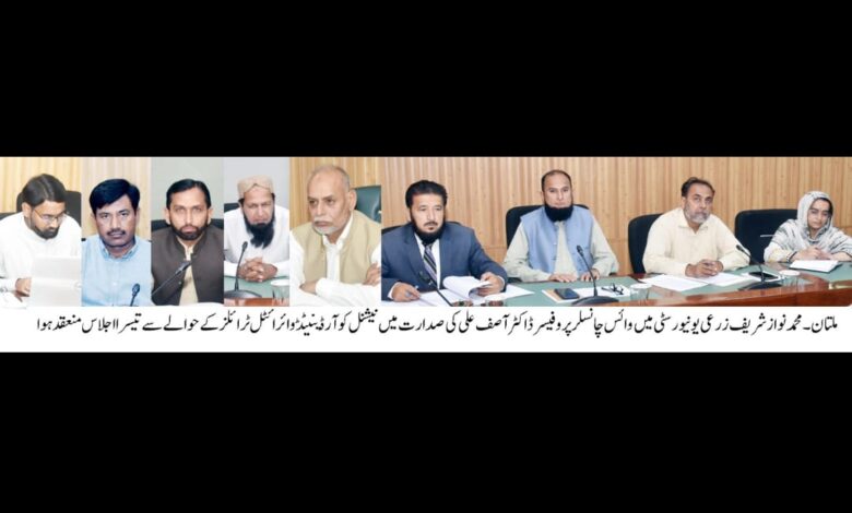 محمد نواز شریف زرعی یونیورسٹی میں نیشنل کوآرڈینیٹڈ وائرائٹل ٹرائلز کے حوالے سے تیسرا اجلاس منعقد ہوا، جس کی صدارت چیئرمین نیشنل سیڈ ریگولیٹری اینڈ ڈیویلپمنٹ اتھارٹی، پروفیسر ڈاکٹر آصف علی نے کی۔