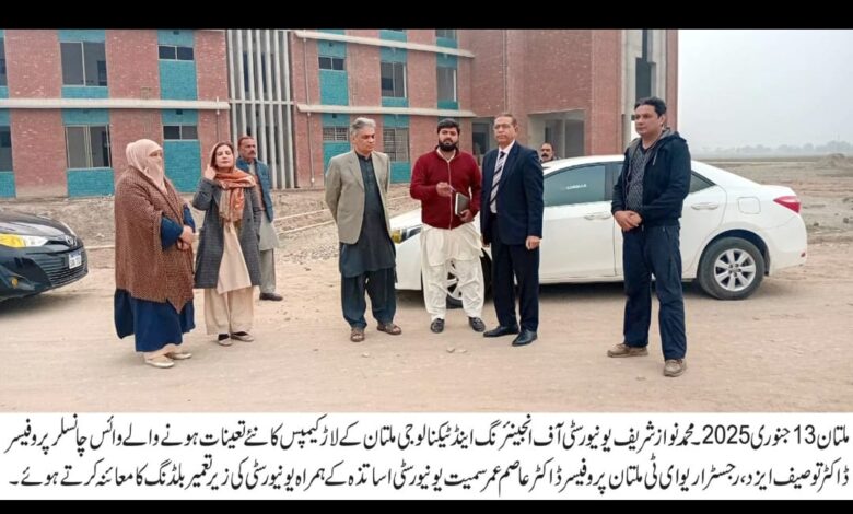 محمد نواز شریف یونیورسٹی آف انجینئرنگ اینڈ ٹیکنالوجی ملتان کے لاڑ کیمپس کے نئے تعینات ہونے والے وائس چانسلر پروفیسر ڈاکٹر توصیف ایزد کا رجسٹرار یو ای ٹی ملتان پروفیسر ڈاکٹر عاصم عمر سمیت یونیورسٹی اساتذہ کے ہمراہ یونیورسٹی کی زیر تعمیر بلڈنگ کا دورہ، اس موقع پر انہوں نے محکمہ سی اینڈ ڈبلیو کی جانب سےکام میں سست روی دکھانے پر ٹھیکیدارکو نوٹس دینے کی ہدایت کی ۔
