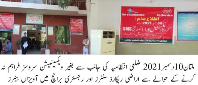 حکومت پنجاب کی ہدایت پر ضلعی انتظامیہ ملتان نے "نو ویکسینیشن نو سروس” کے بھرپور نفاذ کا فیصلہ کیا ہے اس سلسلے میں 14 دسمبر کے بعد ضلعی۔سرکای محکموں میں بغیر کورونا ویکسین سروس فراہم نہیں کی جائے گی۔