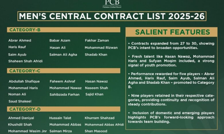 نئے سینٹرل کنٹریکٹس کا اطلاق یکم جولائی 2025 سے 30 جون 2026 تک ہوگا۔ گزشتہ سال 27 کھلاڑیوں کو کنٹریکٹس دیے گئے تھے، جبکہ اس سال یہ تعداد بڑھا کر 30 کر دی گئی ہے، جن میں 12 نئے چہرے بھی شامل ہیں۔