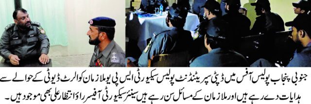 اس حوالے سے گزشتہ روز ایڈیشنل انسپکٹر جنرل پولیس جنوبی پنجاب آفس میں ڈپٹی سپرنٹنڈنٹ پولیس ایس پی یو نے جوانوں کو ان کی ذمہ داریوں کی اہمیت بارے بریفنگ دی اور جوانوں کے مسائل بھی سنے۔