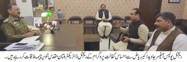 ریجنل پولیس آفیسر ملتان جاوید اکبر ریاض سے احساس کفالت پروگرام کے ریجنل ڈائریکٹر ملتان مقدس تنویر چیمہ نے ملاقات کی، اور احساس کفالت سنٹرز پر حفاظتی اقدامات بارے تبادلہ خیال کیا۔