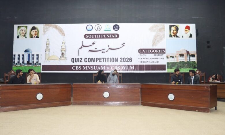 ترجمان کے مطابق ویمن یونیورسٹی ملتان کے زیر اہتمام علمی و ادبی سرگرمیوں کے فروغ کے لیے بین الجامعاتی ’’خزینۂ علم‘‘ کوائز مقابلے کا شاندار انعقاد کیا گیا، جس میں مختلف جامعات کی طالبات نے بھرپور شرکت کرتے ہوئے اپنی علمی قابلیت اور ذہانت کا عملی مظاہرہ کیا