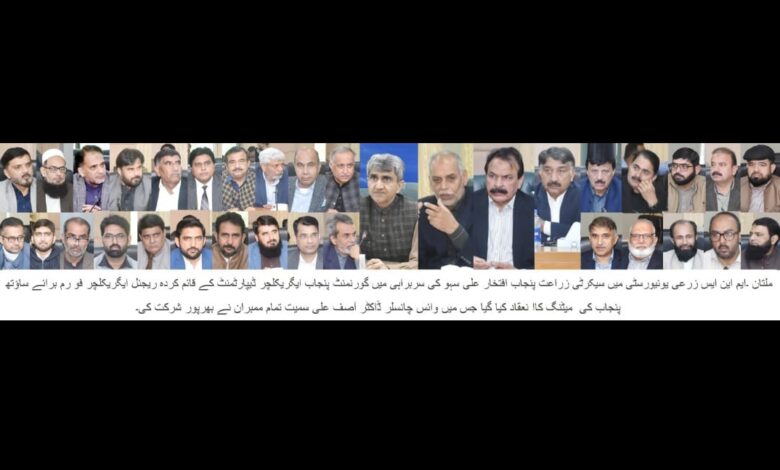 ایم این ایس زرعی یونیورسٹی میں سیکرٹری زراعت پنجاب افتخار علی سہو کی سربراہی میں گورنمنٹ پنجاب ایگریکلچر ڈیپارٹمنٹ کے قائم کردہ ریجنل ایگریکلچر فورم برائے ساؤتھ پنجاب کی چوتھی میٹنگ کاا نعقاد کیا گیا جس میں وائس چانسلر پروفیسر ڈاکٹر آصف علی سمیت تمام ممبران نے بھرپور شرکت کی۔