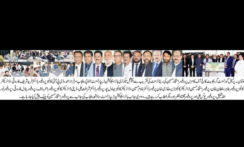 گورنمنٹ گریجوایٹ کالج آف کامرس ملتان اور ہائر ایجوکیشن ڈپارٹمنٹ جنوبی پنجاب کے اشتراک سے پرنسپل ادارہ پروفیسر استخار حسین کے اعزاز میں ریٹائرمنٹ کی تقریب منعقد ہوئی، تقریب کے مہمانِ خصوصی سپیشل سیکرٹری ہائر ایجوکیشن ڈپارٹمنٹ جنوبی پنجاب سرفراز احمد تھے، جبکہ مہمانانِ اعزاز میں ڈی پی آئی کالجز جنوبی پنجاب پروفیسر فرید شریف فاروقی اور ڈائریکٹر کالجز ملتان ڈویژن پروفیسر طاہر سلطان خان شامل تھے۔