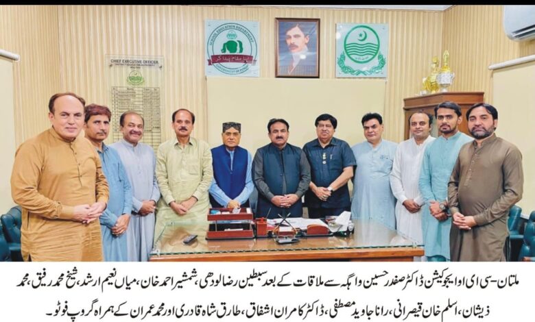 سی ای او ایجوکیشن ملتان ڈاکٹر صفدر حسین واہگہ نے مزید کہا کہ سرکاری سکولوں میں معیار تعلیم میں بہتری اور شرح خواندگی میں اضافہ اولین ترجیح ہے ۔ کمشنر ملتان ڈویژن عامر کریم خان اور ڈپٹی کمشنر حامد وسیم سندھو کی رہنمائی میں سرکاری سکولوں میں سازگار تعلیمی ماحول کی فراہمی کے لیے عملی اقدامات کیے جا رہے ہیں۔