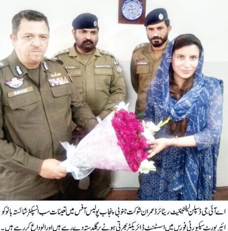 اے آئی جی ڈسپلن ساؤتھ پنجاب پولیس لیفٹیننٹ ریٹائرڈ عمران شوکت نے جنوبی پنجاب پولیس آفس میں تعینات سب انسپکٹر شائستہ بانو کو ائیرپورٹ سیکیورٹی فورس میں بطور اسسٹنٹ ڈائریکٹر بھرتی ہونے پر گلدستہ پیش کیا، اور مبارکباد دی ۔