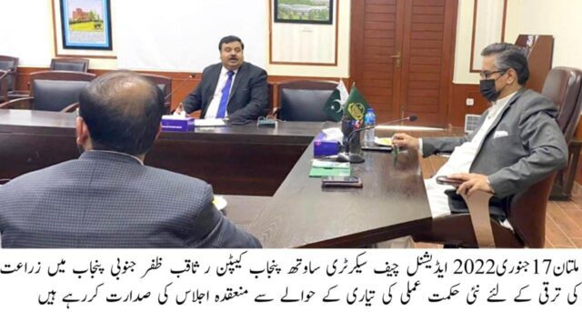 سیکرٹری زراعت جنوبی پنجاب ثاقب علی عطیل نے اس موقع پر نئی زرعی حکمت عملی کے حوالے سے بریفنگ دی۔ایڈیشنل چیف سیکرٹری ساوتھ پنجاب کیپٹن ر ثاقب ظفر نے کہا کہ فصلوں کی پیداواری صحلاحیت کو بڑھایا جائے اور ہر فصل کے لئے بہترین استعداد رکھنے والے علاقے کے زون قائم کئے جائیں۔