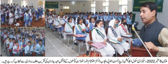 وہ گورنمنٹ بوائز کمپری ہنسیو ہائیر سکینڈری سکول ملتان میں سٹوڈنٹ کونسلز کے نومنتخب عہدیداران کی تقریب حلف برداری میں بطور مہمان خصوصی خطاب کر رہے تھے۔
