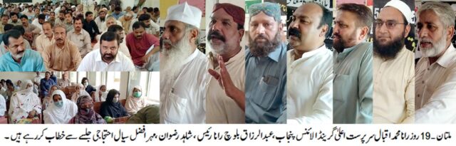 رانامحمد اقبال سرپرست اعلیٰ گرینڈا لائنس پنجاب، عبدالرزا ق بلو چ چیئرمین گرینڈ الائنس پنجا ب، شاہد رضوان وائس چیئرمین گرینڈ الائنس پنجاب، مہر افضل سیال وائس چیئرمین ٹاسک فورس ساؤتھ زون ملتان نے احتجاجی جلسے سے خطاب کرتے ہوئے کہا کہ پنجاب بھر کے ٹیوٹا کے ماتحت ادارہ جات میں مکمل ہڑتال اور تالہ بندی کی، اپنے اپنے ادارہ جات میں احتجاجی مظاہرے جاری کئے، ہڑتال اور تالہ بندی19 ویں رو ز بھی جاری ہے لیکن تاحال حکو مت پنجاب، ٹیوٹا حکام نے ٹیوٹا ملازمین اورPSIC ملازمین کا25% جون 2021 سے اور 15% یکم مارچ 2022 سے نو ٹیفکیشن جاری نہ کئے۔