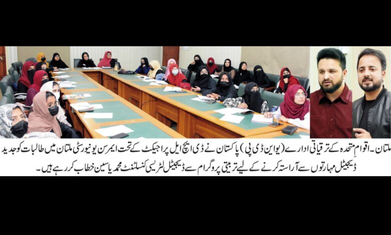 اقوامِ متحدہ کے ترقیاتی ادارے (یو این ڈی پی) پاکستان نے ڈی ایچ ایل پراجیکٹ کے تحت ایمرسن یونیورسٹی ملتان میں طالبات کو جدید ڈیجیٹل مہارتوں سے آراستہ کرنے کے لیے خصوصی تربیتی پروگرام کا آغاز کر دیا ہے۔