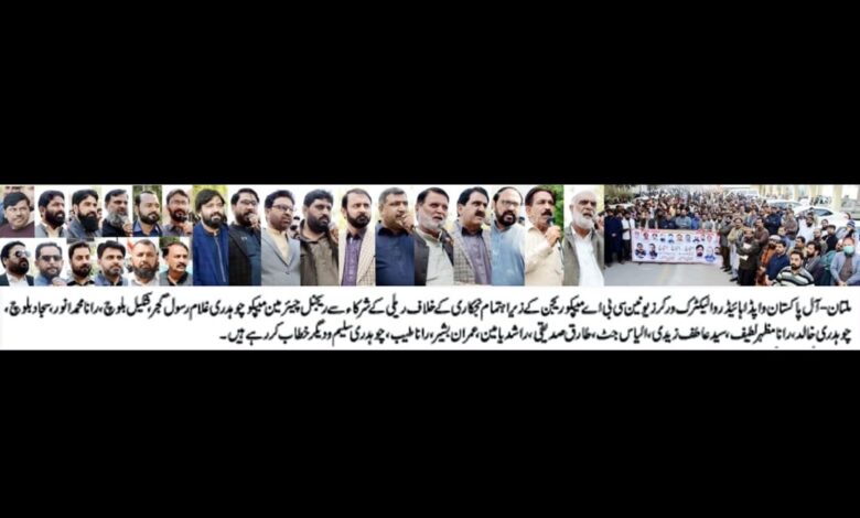 آل پاکستان واپڈا ہائیڈرو الیکٹرک ورکرز یونین سی بی اے کے مرکزی صدر عبداللطیف نظامانی، مرکزی جنرل سیکرٹری خورشید احمد کی ہدایات پر ریجنل چیئرمین میپکو ملتان چوہدری غلام رسول گجر کی قیادت میں میپکو ہیڈکوارٹر میں مطالبات کے حق میں احتجاجی مظاہرہ کیا گیا۔